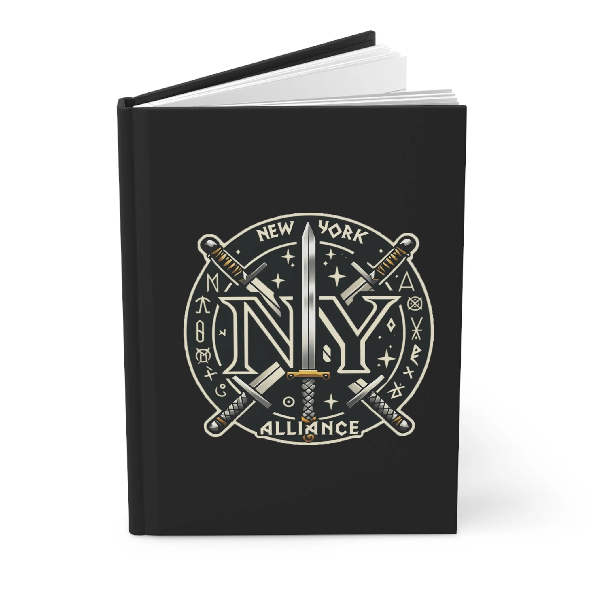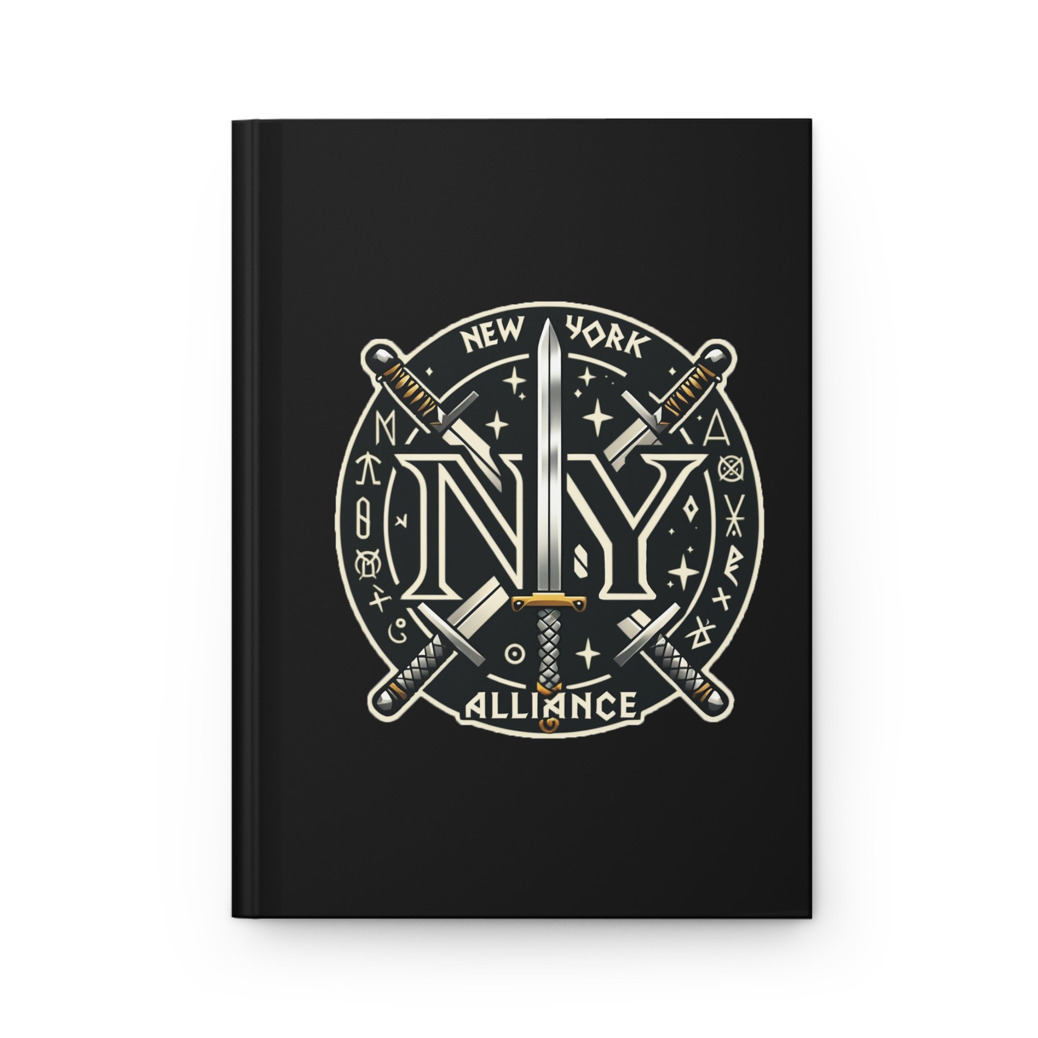 A matte hardcover journal made to be used and carried. The cover’s deep black backdrop and bold emblem — crossed swords framing a stylized “NY” crest — set a confident, focused tone before you open to the lined pages. The sewn casewrap binding lets the book lay cozy in your hands while you jot, plan, or sketch. Perforated pages give you the freedom to remove notes cleanly. With vibrant, fade-resistant printing and a full wraparound design, this journal feels solid and purposeful on a desk or in a bag. The modest production barcode is printed on the back cover.